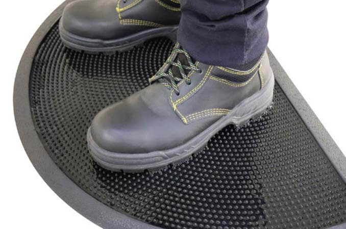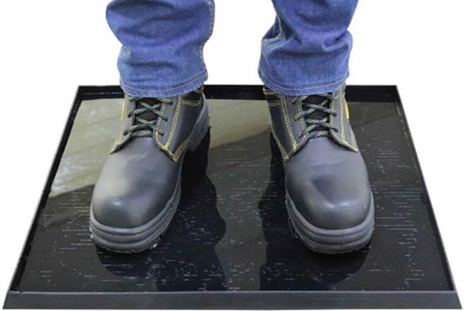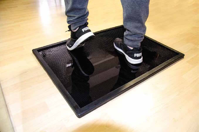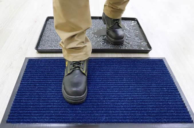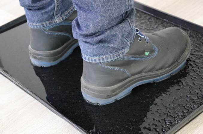 . Cuando los tapetes sanitizantes son llenados con solución desinfectante miles de “costillas limpiadoras” retienen la contaminación y los gérmenes de las suelas de los zapatos.